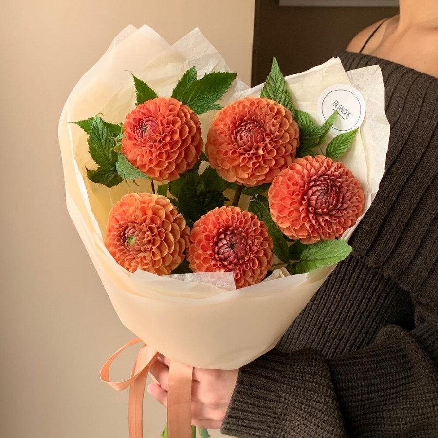 На фото букет из 5 оранжевых георгин. В составе: георгина 5 шт, зелень 2 шт, дизайнерская упаковка 1 шт, атласная лента 1 шт, . Все цветы свежие и ароматные, букет красиво оформлен и отлично подходит для подарка. Доступна доставка цветов или самовывоз.